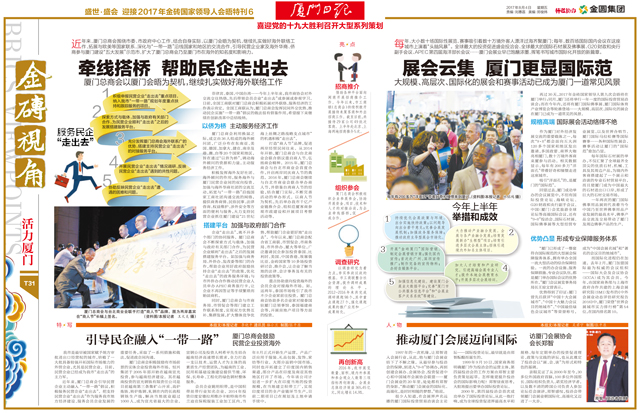? ? ? ? 近年来,厦门总商会指导民营企业自动融入“一带一起”建议,起劲服务民营企业“走出去”。把支持民营企业“走出去”作为服务我市地方经济建设、服务会员企业生长的主要使命,接纳了一系列步伐和做法,增进政企间相同。